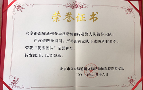 2020年12月,公安部對全國抗擊疫情表現(xiàn)突出保安集體和個(gè)人通報(bào)表揚(yáng)。北京都杰安防科技有限公司河北分公司,榮獲“表現(xiàn)突出集體”稱號。